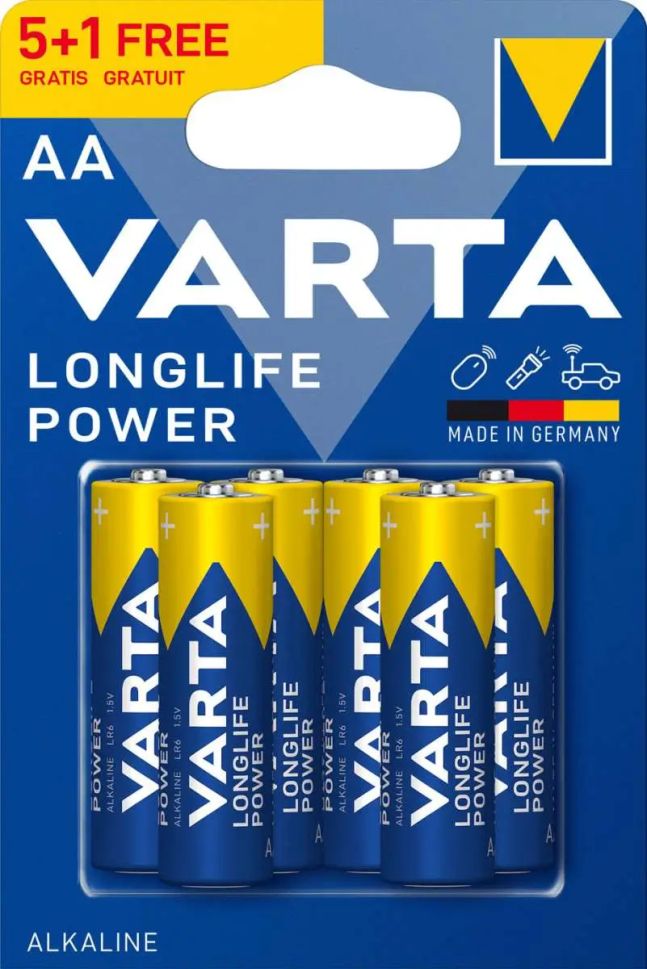 Varta Longlife Power LR6 AA алкалните батерии са висококачествени продукти, произведени в Германия от един от най-уважаваните производители на акумулатори - VARTA. Те са част от серията High Longlife Power, която предоставя супер мощни алкални батерии за професионална употреба. Тези батерии имат капацитет приблизително 2850mAh. Те са подходящи за множество устройства като дистанционни управления, играчки, домашни уреди, часовници, калкулатори, фенери, радиостанции и други. Благодарение на високата им производителност, тези батерии са идеални за устройства, които изискват по-голяма консумация на енергия, като например фотоапарати, безжични мишки и клавиатури, портативни радиостанции и други професионални инструменти.